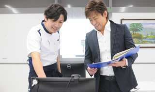 一日の始まりはスケジュールの確認から。予約状況、進捗をチェックして朝礼に臨む。 -